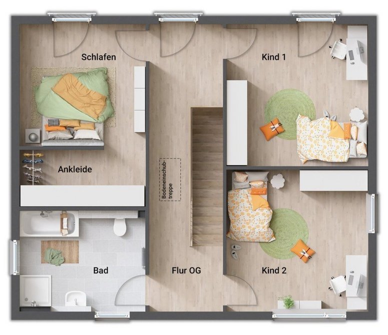 Auch das Obergeschoss zeigt sich im gradlinigen Baustil des Hauses. Hier finden Sie drei Zimmer, die Sie nach Ihren Vorstellungen als Schlaf-, Kinder- oder Gästezimmer nutzen können. Große Fenster lassen auch hier viel Tageslicht hineinströmen. Die Ankleide im Schlafzimmer bietet viel Stauraum.