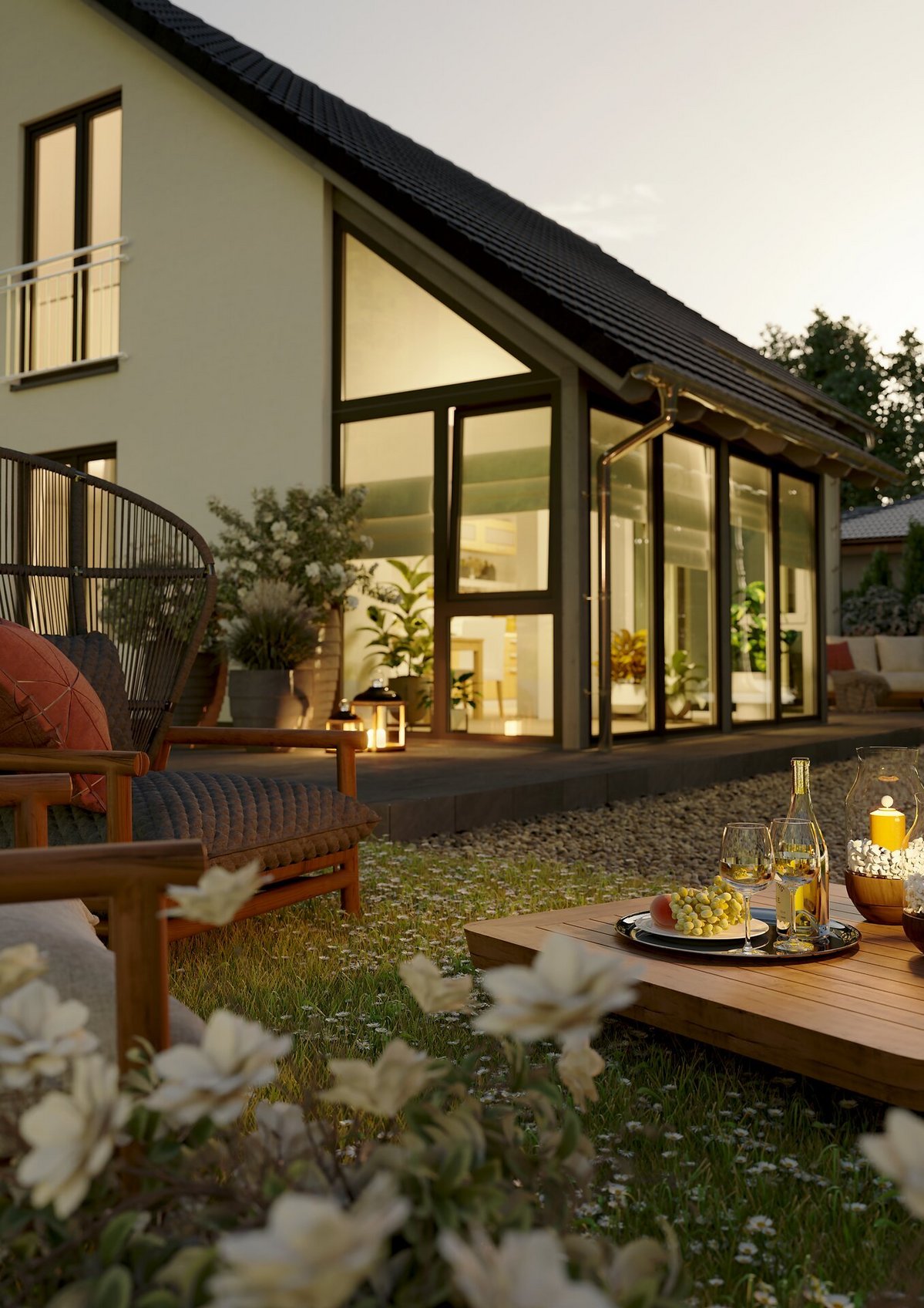 Nach Vertragsabschluss beginnen die Architekten mit dem Hausentwurf. Sie entscheiden über Raumaufteilung, Dachform, Fassadenmaterialien etc. Wir integrieren gewünschte Extras (Bungalow-Option, Keller, Solaranlage). Jeder Planungsstand wird gemeinsam abgestimmt.